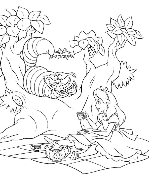 The mad tea party was hosted by Mad Hatter, March Hare, and Dormouse, in which Cheshire Cat invite Alice to join.